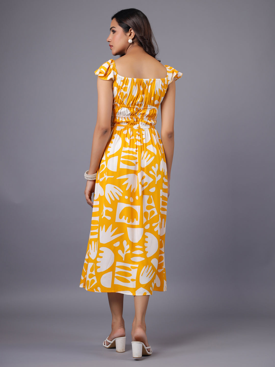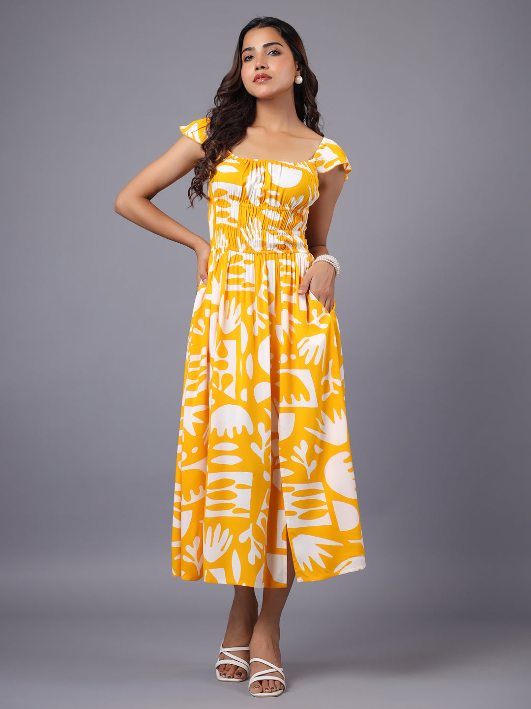 Embrace summer vibes with this yellow and white tropical print midi dress, perfect for casual outings or beach getaways. Designed with a shirred bodice dress for a flattering fit, this midi dress features stylish cap sleeves and a thigh-high slit for a playful yet elegant touch. Crafted from lightweight fabric, it ensures comfort while keeping you effortlessly chic. Pair this tropical print midi dress with strappy heels or sandals for a stunning summer look! Gracefully airy, flutter poet sleeves bring a whimsical and elegant touch to your Dress.