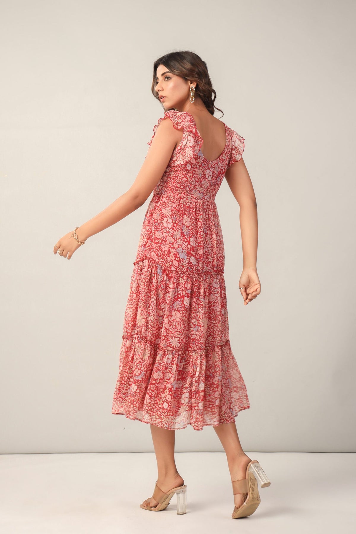 Red Floral Midi Dress: V-Neck, Ruffled Sleeves