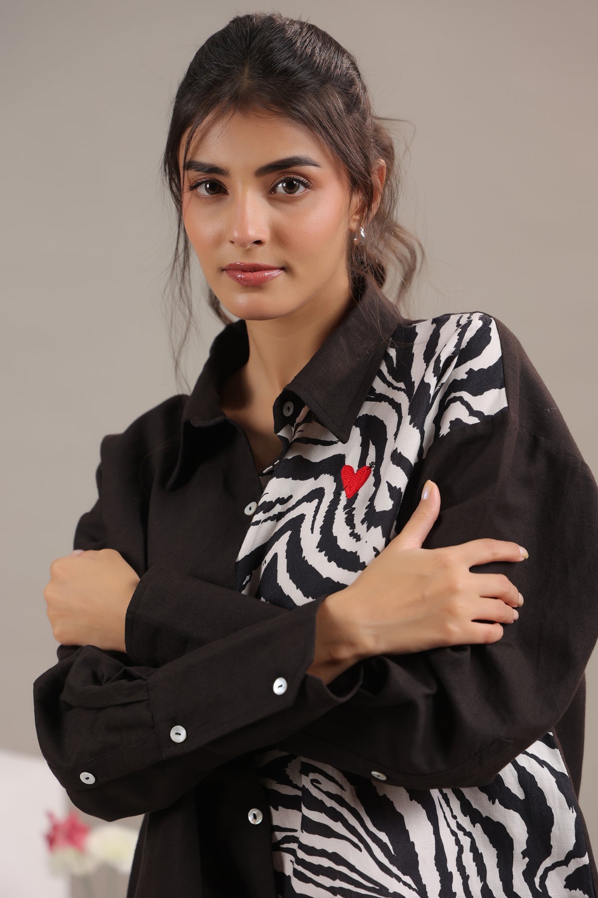 This black and white animal print shirt for women features a stylish oversize fit, collar neck, and long sleeves. Made from breathable cotton linen, it offers comfort and casual elegance for daily wear. Perfect for brunch, casual outings, or office casual looks.