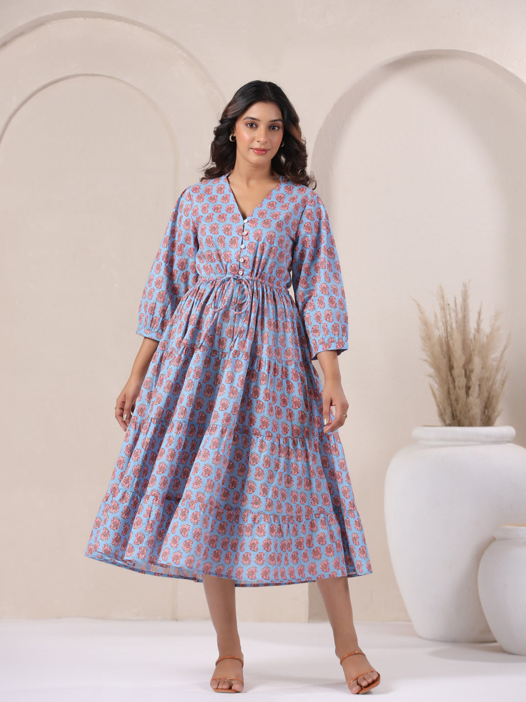 Add effortless elegance to your wardrobe with this Powder Blue Paisley Dress, crafted in breathable cotton for comfort and style. Featuring timeless paisley print, this maxi dress blends classic charm with a modern fit-and-flare design that flatters every movement.
