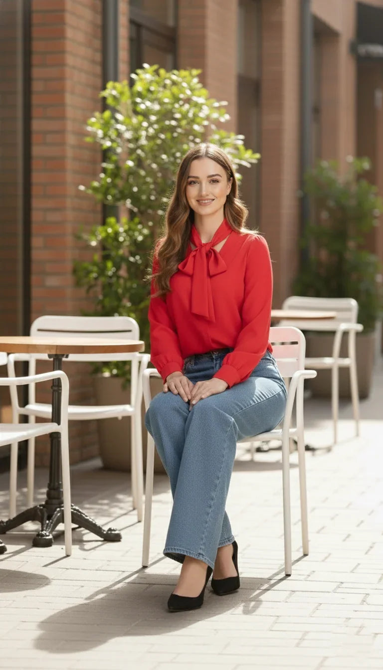 Style this red shirt with high-rise trousers or skirts for a polished outfit. Minimal accessories enhance its bold color.