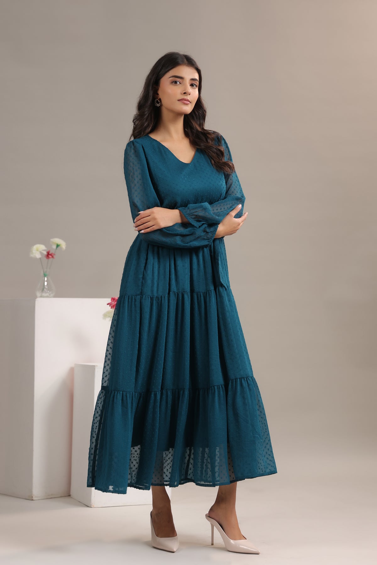 This midi dress is crafted in premium chiffon dobby with a poly knit lining, ensuring a soft, breathable, and comfortable wear. Designed in a flattering fit & flare silhouette with a tiered finish, it offers graceful movement and an elegant yet modern vibe. Featuring a V-neckline and a sophisticated self-design pattern, this dress is perfect for parties, evening gatherings, or special events. It is available in Plus Sizes (XL, XXL). For best results, machine wash on a gentle cycle with cold water and similar colors."