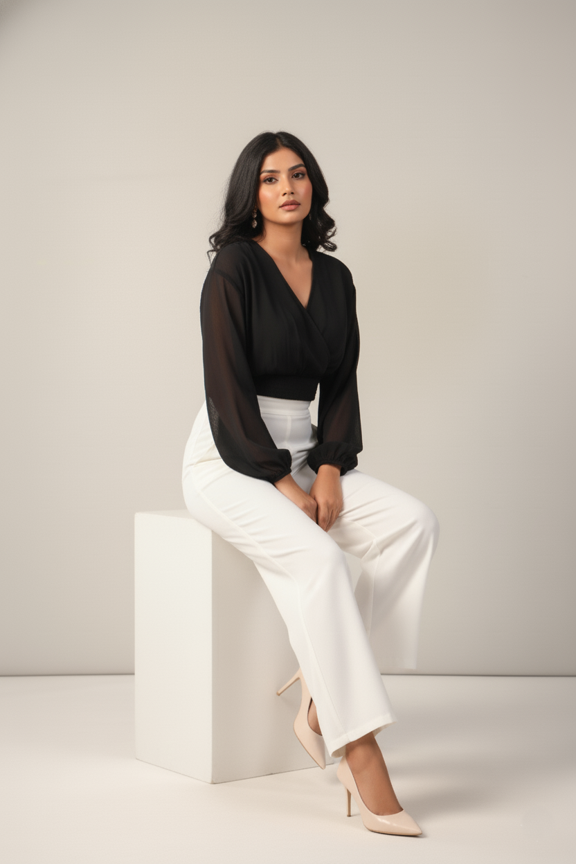Whether you're heading to brunch or a night out, this stylish black crop top pairs beautifully with flared pants, high-waisted denims, or even a long ethnic skirt for a fusion look. Add heels and statement earrings for an elevated fashion ensemble. Elegant and timeless, bishop sleeves offer graceful volume with a refined, feminine finish.
