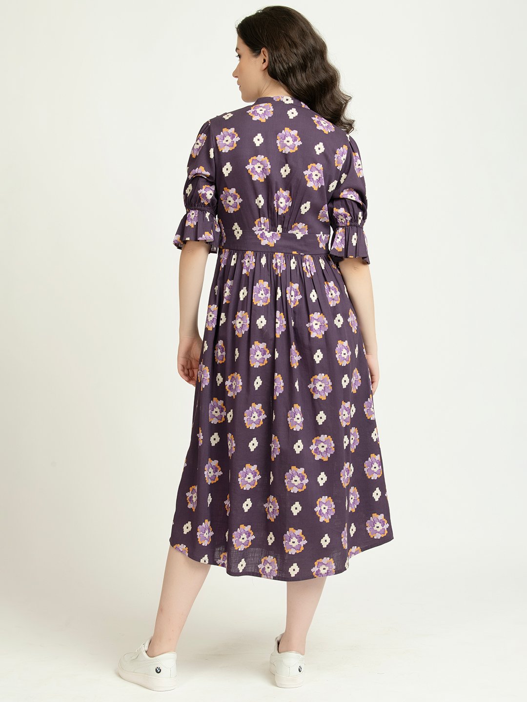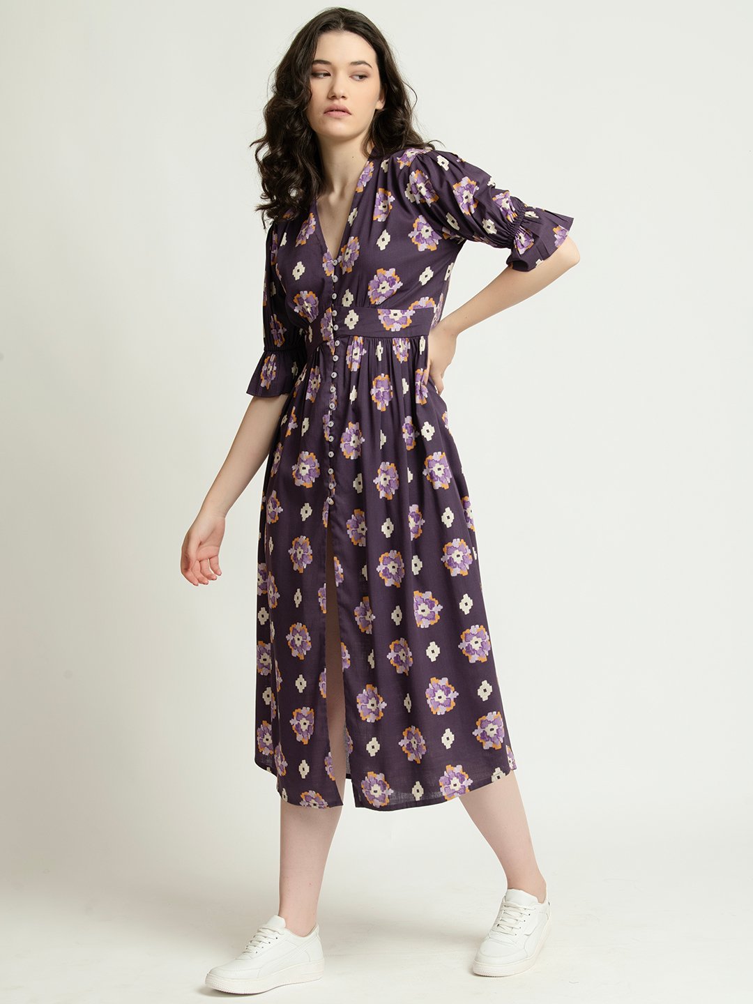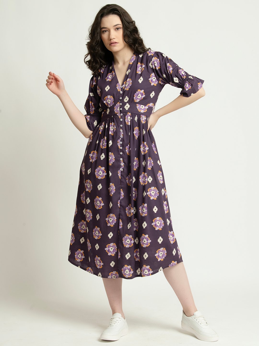 Wear the Purple Floral Ankle-Length Dress from June 9 Clothing. A versatile dress designed to bring both comfort and charm to your wardrobe. Featuring a flattering V-neckline and functional buttons, this dress lets you style it your way—button it up for a refined look or leave a few open for a breezy, relaxed vibe. Crafted from soft and breathable Rayon Linen, this dress is perfect for all-day wear. The ankle-length cut strikes the ideal balance between playful and polished, making this dress suitable for brunches, vacations, or evening outings. With its timeless floral print and graceful silhouette, this dress is the perfect addition to your collection for any season. Featuring elegant 1/2 poet sleeves a, this dress blends softness with structure for a graceful silhouette.