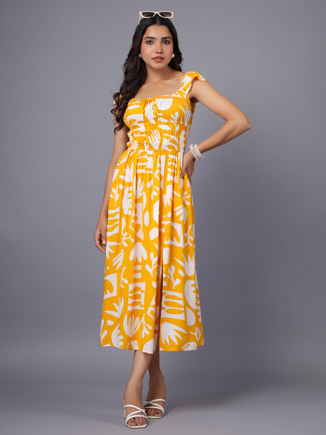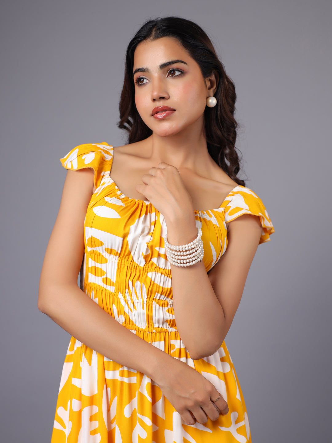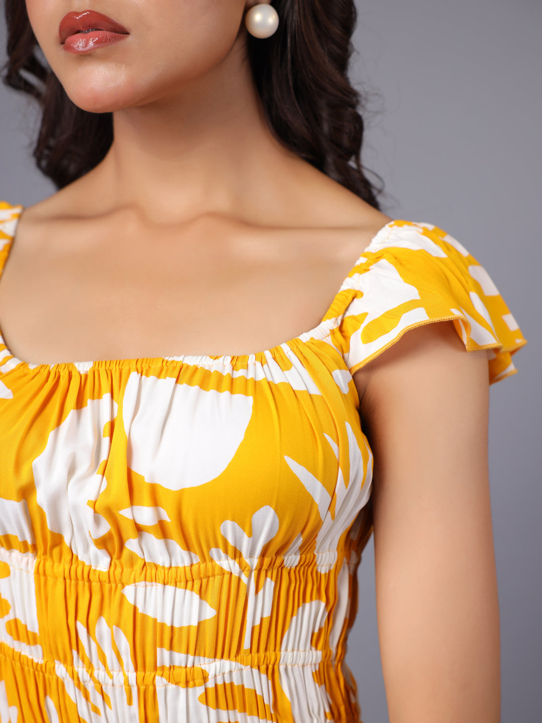 Embrace summer vibes with this yellow and white tropical print midi dress, perfect for casual outings or beach getaways. Designed with a shirred bodice dress for a flattering fit, this midi dress features stylish cap sleeves and a thigh-high slit for a playful yet elegant touch. Crafted from lightweight fabric, it ensures comfort while keeping you effortlessly chic. Pair this tropical print midi dress with strappy heels or sandals for a stunning summer look! Gracefully airy, flutter poet sleeves bring a whimsical and elegant touch to your Dress.