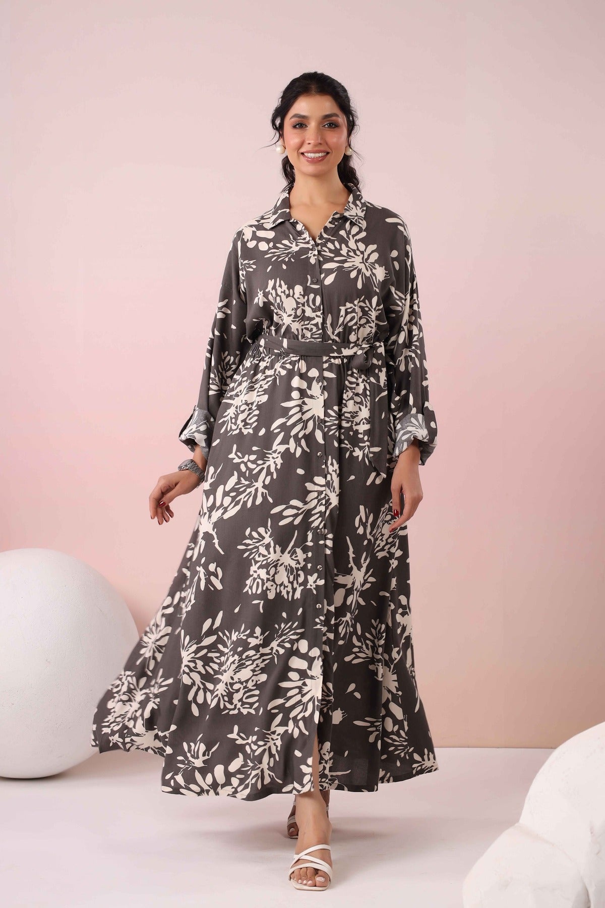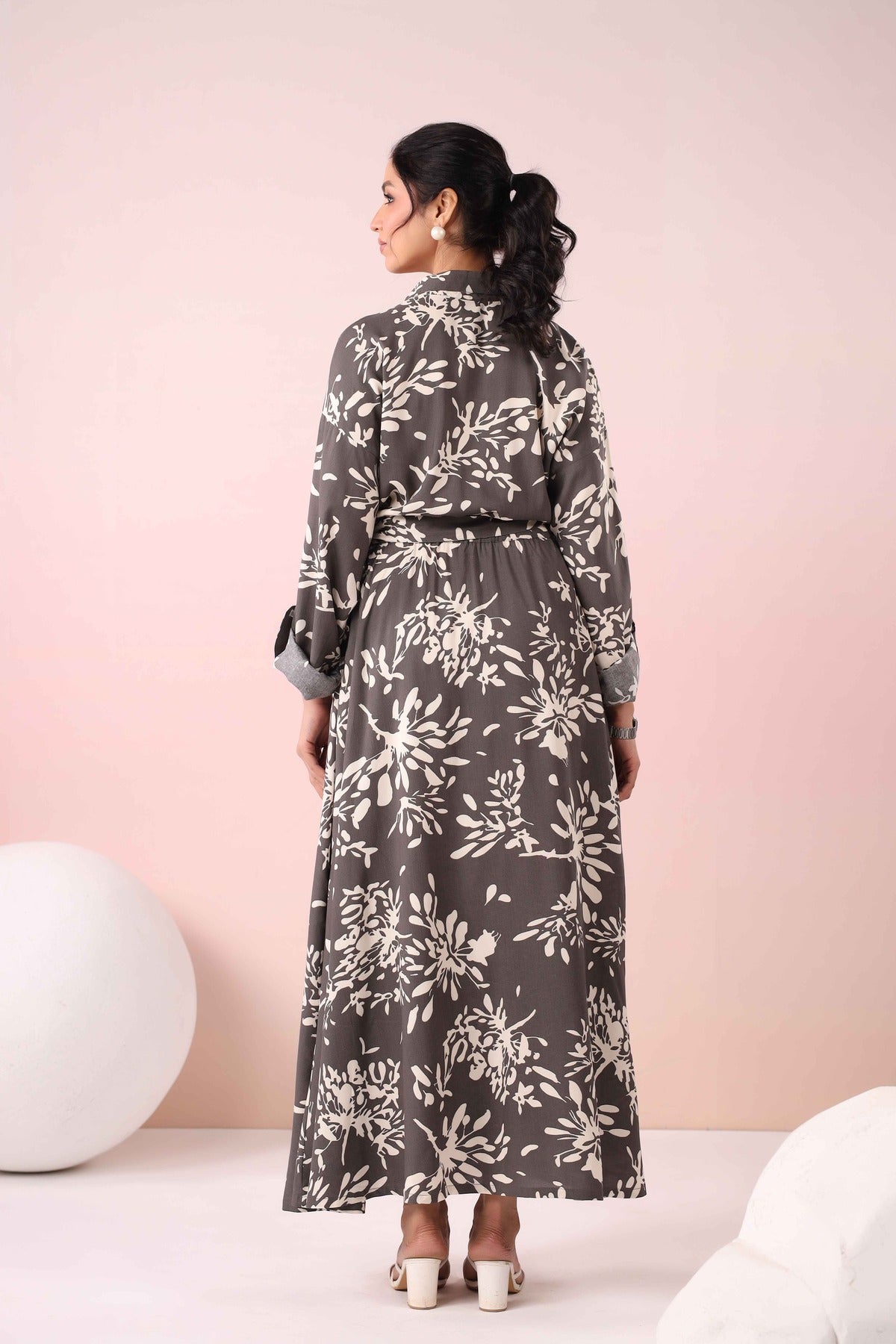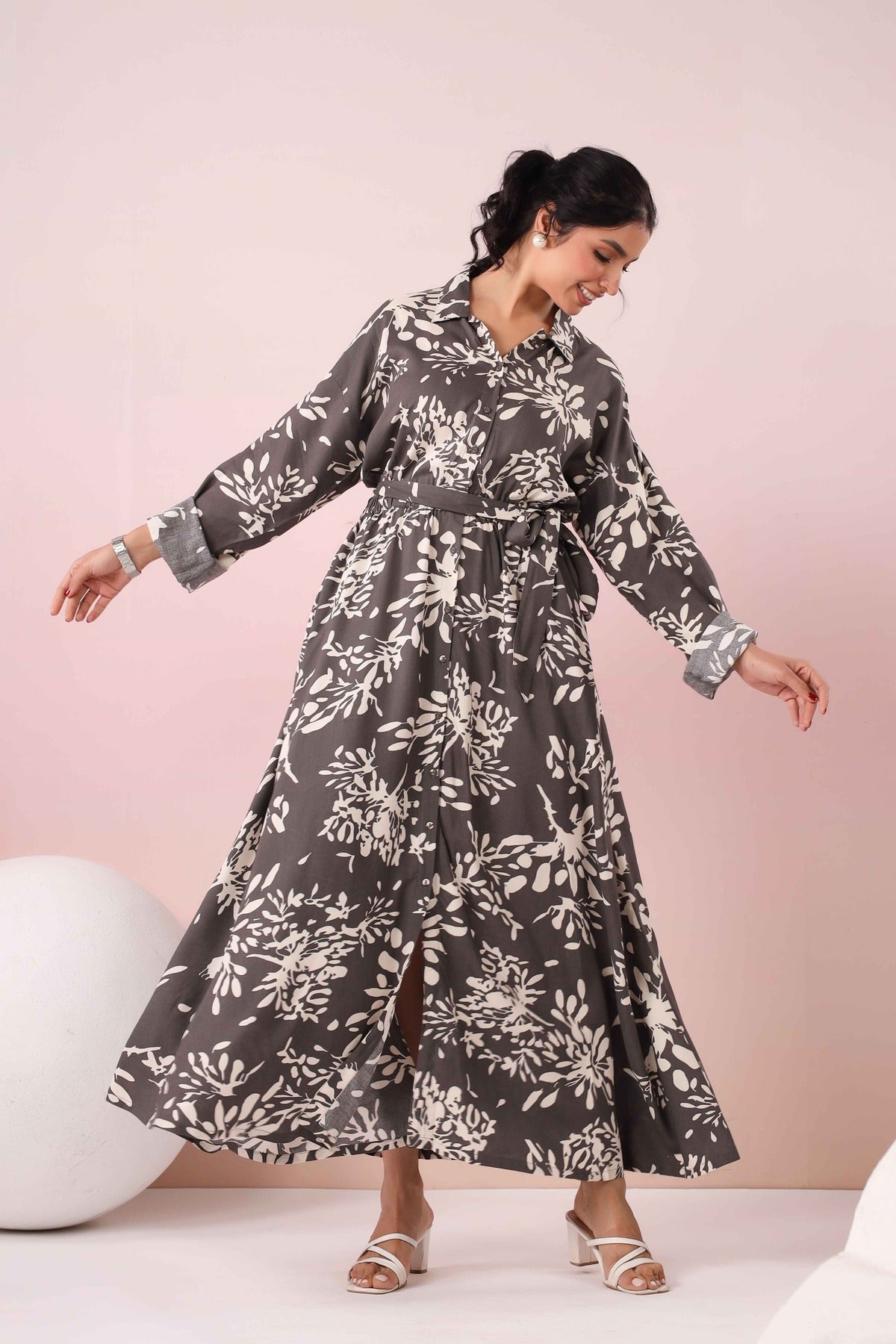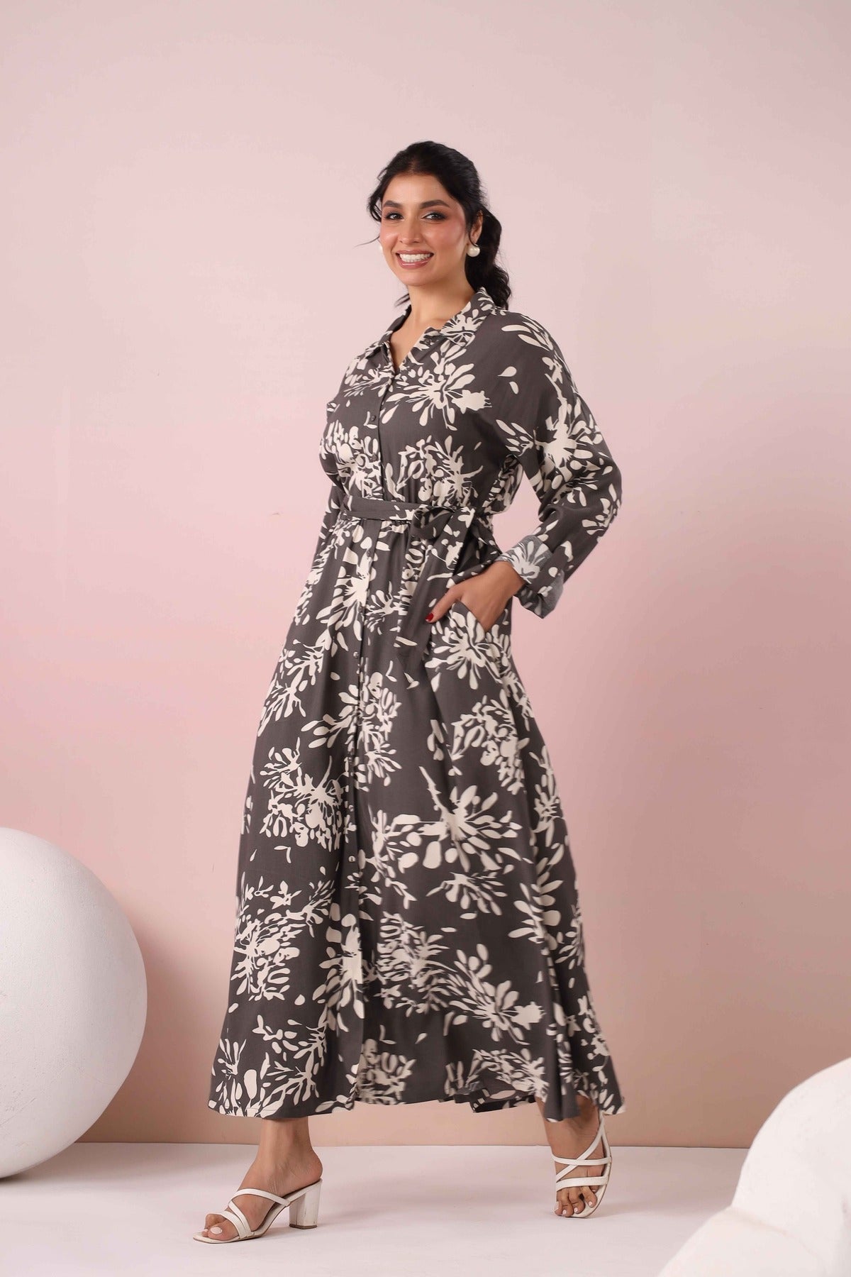 Elevate your wardrobe with June 9 Clothing’s Grey and White Floral Dress—a timeless dress that blends grace and comfort effortlessly. Crafted from premium, breathable fabric, this dress is lightweight yet sophisticated, making it perfect for warm-weather wear. The dress features a classic collared neckline, full-length sleeves, and an elegant floral print that adds charm to any occasion—be it garden parties, brunches, or casual evenings out. Its soft grey base and delicate pattern capture the serene essence of summer. With a flattering cut and floor-length hem, this dress offers both comfort and elegance. Whether you're dressing up for the day or styling it for the night, this versatile dress ensures you look effortlessly chic every time. Elevate your style with classic cuffed sleeves, tailored for a crisp and polished finish.