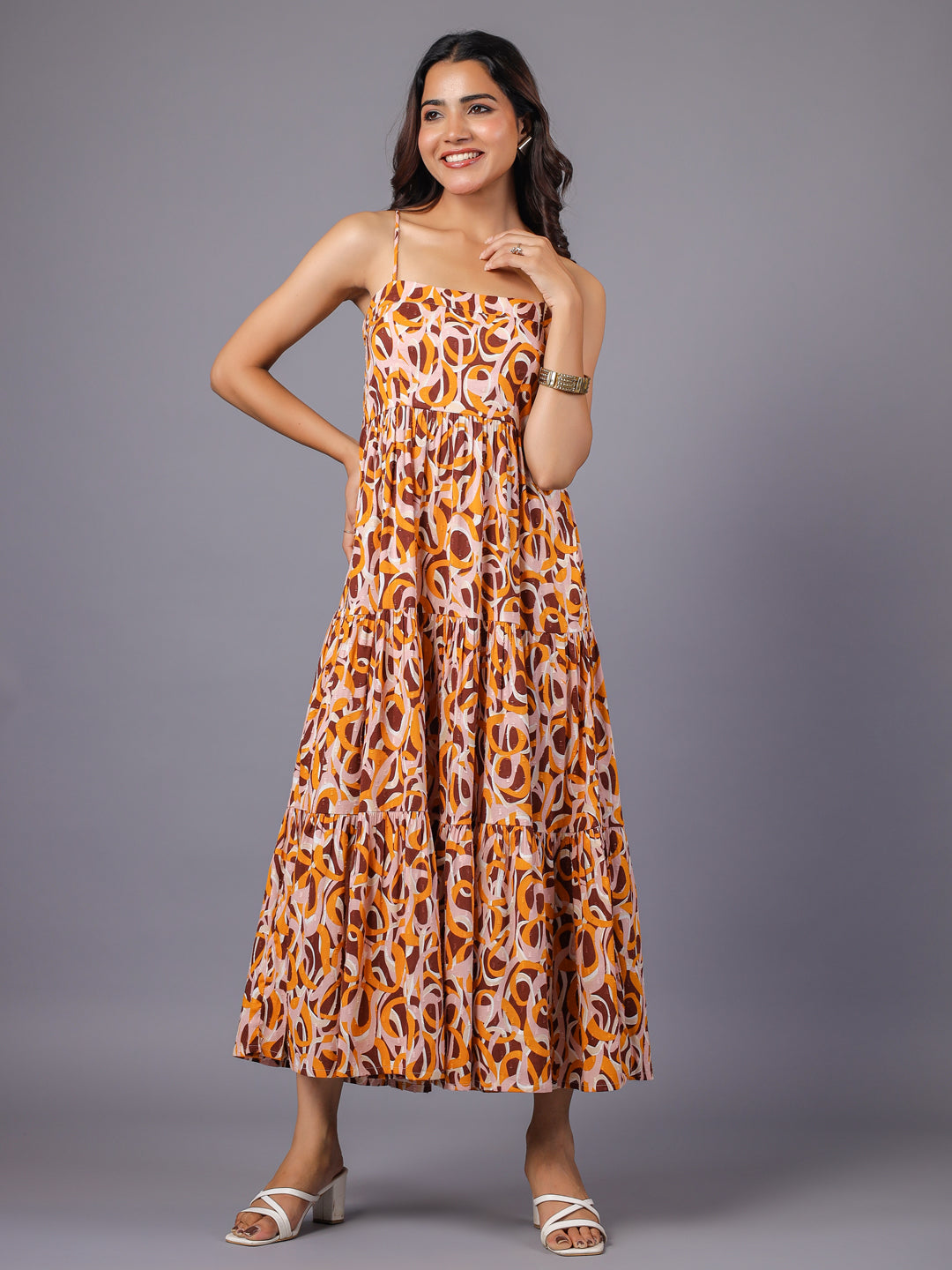 This breezy maxi Dress features an eye-catching abstract print in warm tones of Beige and Brown. Designed with delicate spaghetti straps and a tiered silhouette, it offers effortless elegance and flowy movement. Perfect for daytime outings and casual gatherings, this comfortable strappy maxi dress adds a fun and feminine touch to your wardrobe.